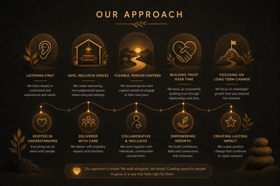 We recognise that stepping into a new environment can feel intimidating, especially for those who have not previously accessed support or who feel that certain spaces are not designed for them.